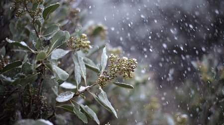 First snow falling gently on Guayule, a few snowflakes drifting slowly and settling on the leaves; fresh air.