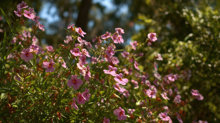 The Diascia in summer, Bright sunlight pierces dense foliage, the air feels hot, natural color