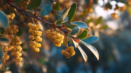 The Guayule at sunset, Golden red sunset light filters through the leaves, still atmosphere, warm orange glow blending with natural green tones.
