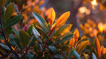 The Bay laurel at sunset, Golden red sunset light filters through the leaves, still atmosphere, warm orange glow blending with natural green tones.