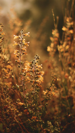 The Penstemon in fall, warm amber light, crisp air, shallow depth of field, soft natural bokeh, true to life color, minimal styling.