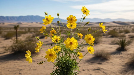 Yellow cosmos flowers in the middle of a desert landscape with mountains in the background