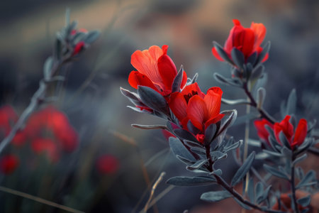 A close-up captures desert vegetation with red-orange flowers and a blank sign. The scene presents a dry, textured landscape under natural light. The composition features a shallow depth of field, with the focus on the foreground. Suitable for editorial and commercial applications.