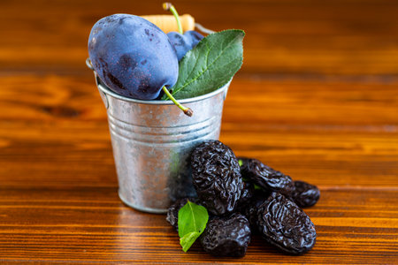 Fresh prunes in wooden bowl. Dried plums. Healthy food.