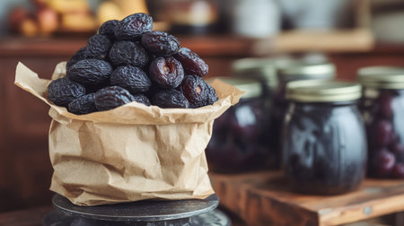 Hand reaching into a paper bag full of fresh, soft prunes on a cozy countertop