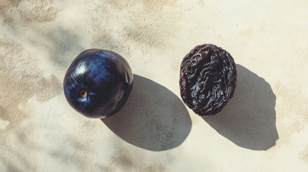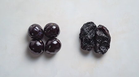 Fresh prunes with a glossy finish beside dried prunes with wrinkled texture, displayed on a light background for contrast.