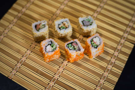 Japanese food. Sushi on a bamboo mat.