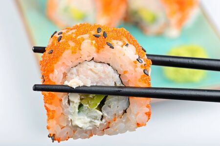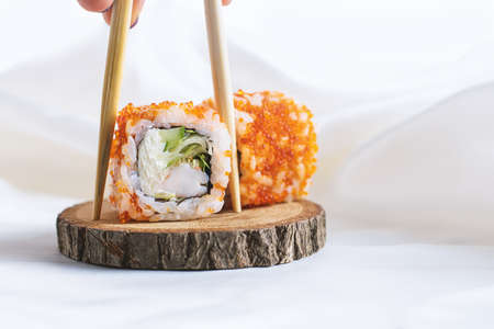 Sushi roll japanese food in restaurant. Two sushi rolls with shrimp, vegetables, flying fish roe closeup. Eating Sushi with chopsticks