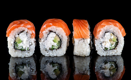 Traditional delicious fresh sushi roll set on a black background with reflection. Sushi roll with rice, cream cheese, red fish, salmon. Sushi menu. Japanese kitchen, restaurant. Seafood, asian food