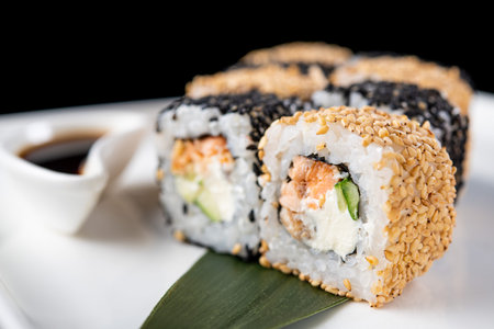 Close up tasty Japanese rolls on plate