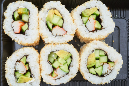 Close-up of set of delicious and tasty sushi with sesame seeds composed in plastic black container