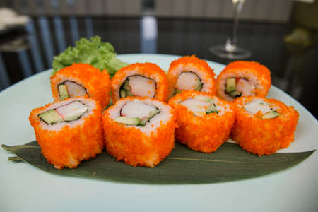 Sushi Uramaki with fish, green algae, rolls sprinkled with red caviar in a blue plate