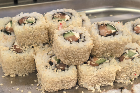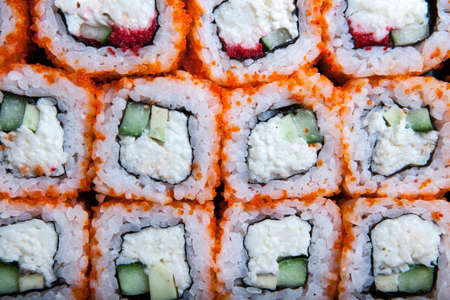 Maki sushi japanese roll oriental menu in restaurant, closeup photography freshness food set california roll healthy eating traditional cookery appetiser recipes