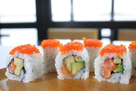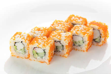 California rolls on a white background with red caviar