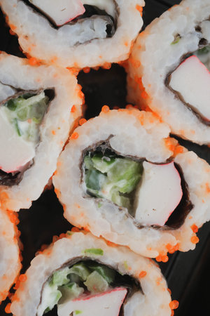 Sushi roll philadelphia with salmon, rice, cheese, cucumber, avocado and caviar on slate board. Japanese food