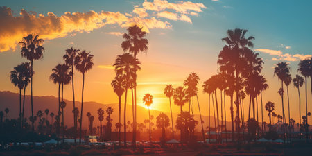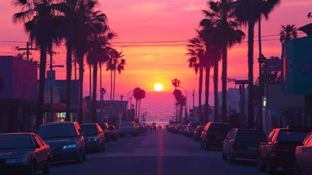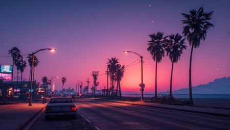 An urban scene depicts palm trees silhouetted against a colorful sunset. A car is parked on a road, with streetlights illuminating the foreground. The sky transitions from purple to orange. The image could be suitable for promotional materials, or as a backdrop for various creative projects.
