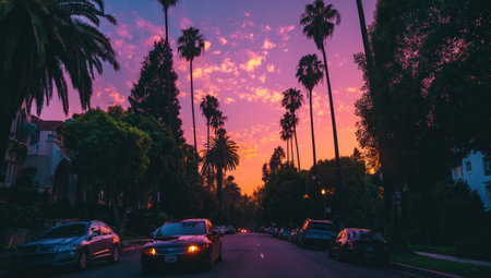 An eye-level view captures a residential street at sunset. Palm trees and other trees line the street, with parked cars on the sides. The sky transitions from orange to purple, casting long shadows. This image could be used for travel, lifestyle, or design purposes.
