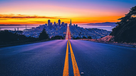 Road stretches into a city skyline at dawn, with a vibrant sunrise and colorful city landscape. The road is empty, creating a sense of openness and perspective.