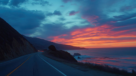 Stunning coastal scene at dusk featuring vibrant sunset colors illuminating the sky above a winding highway and tranquil ocean waves. Perfect for travel lovers.