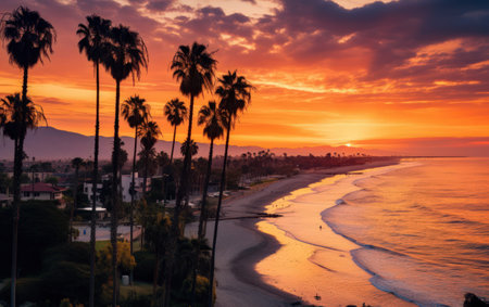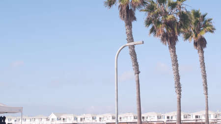 Row of palm trees on street in waterfront beachfront city near Los Angeles and Santa Monica, California summertime vibes, USA. Waterside summer vacations, palmtrees by ocean beach or coast, blue sky.