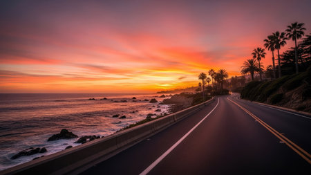 scenic highway leading to sunset over the ocean, with waves rolling in, created with generative ai