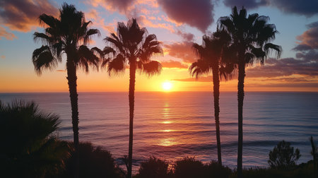 Palm trees in silhouette as the sun sets over a calm ocean, with rich colors of the sky blending together