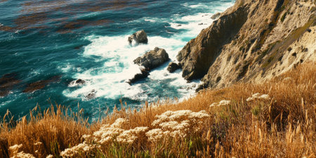 A rugged coastline with dramatic cliffs plunging into the turquoise ocean. Waves crash against the rocks, sending up sprays of white foam. The scene is framed by windswept grass and wildflowers growing on the cliff edge.
