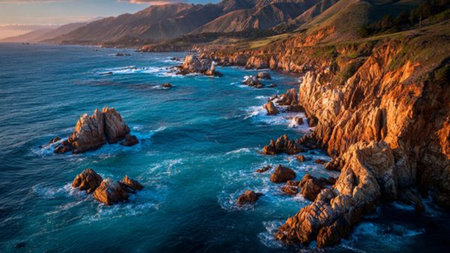 a stunning photograph of big sur captures the essence of an ideal vacation. the dark gold and light aquamarine hues create a romantic landscape, reminiscent of the picturesque scenery. shot with a rollei prego 90, the atmospheric imagery showcases the beauty of this destination. the light indigo and white tones add to the surreal ambiance, while the use of unreal engine 5 enhances the landscape
