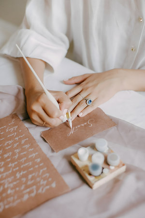 Girl writing calligraphy on postcards. Art design. Copy space.