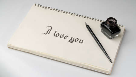 Paper, ink, calligraphy pens and inscriptions. Lettering workshop details. Inscribing ornamental decorated letters. Calligraphy, graphic design, lettering, handwriting, creation concept