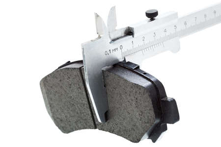 brake pads of the car on a white background, measurement by a caliper of thickness, isolated image nobody.