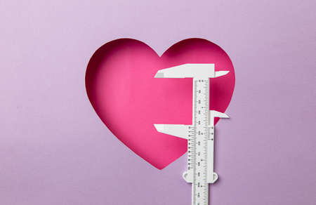 Pink heart on a purple background. At the heart is a white micro meter. Concept measuring love.