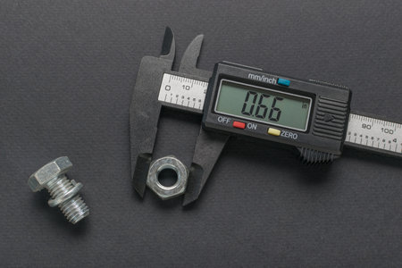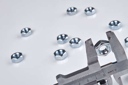 Measuring the nut width with an electronic caliper. Measuring accessories in a home workshop. Light background.