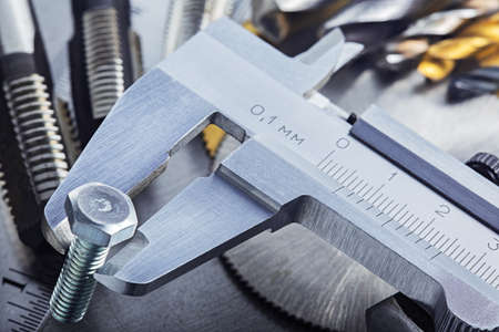 Measuring with vernier caliper thread tap for locksmitning work on steel plate. Locksmithing workshop.