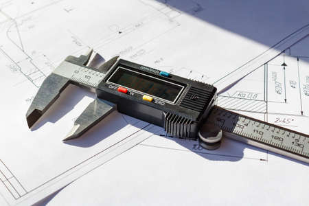 Electronic caliper lies on a engineering drawings
