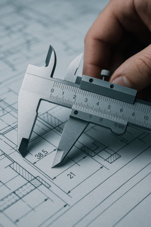 Caliper measuring precise dimensions on architectural blueprint with careful hand control