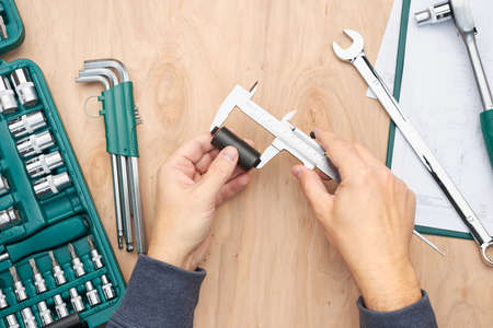 Man measuring object using calliper. Workshop table with many tools. Wrench, spanner, calliper and ratchet with many attachments. Work tools. Universal tool set. Professional equipment. Background