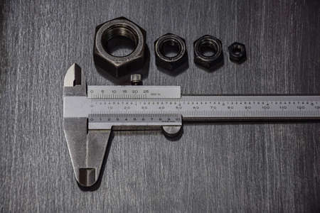 Electronic vernier caliper and metal screws and nuts. A tool for accurate measurement of dimensions.