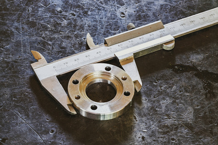 Close up vernier caliper measure diameter of stainless steel flange
