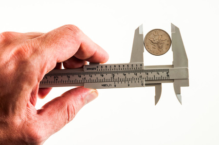 Vernier caliper measures coins against a dark background, toned