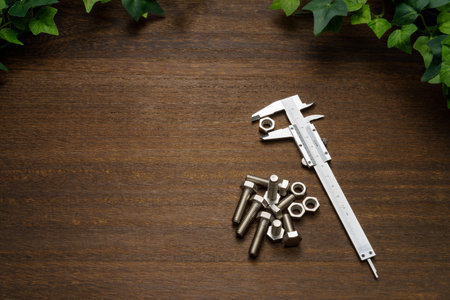 Caliper, bolt and nut on a table in a workshop