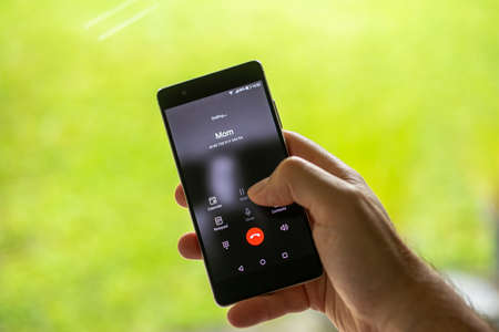 Caucasian male hand dialing his Mom on his cell phone. Close up shot, shallow depth of field, green defocused background.