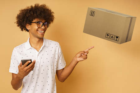 Delivery man holding cardboard box and using mobile phone, online shopping concept