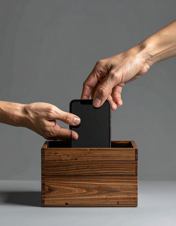 A person takes a deliberate step towards mindfulness by placing their smartphone into a wooden box.