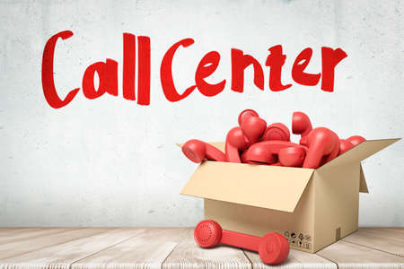 3d rendering of red retro telephone receivers in a cardboard box with Call center sign on white wooden floor background