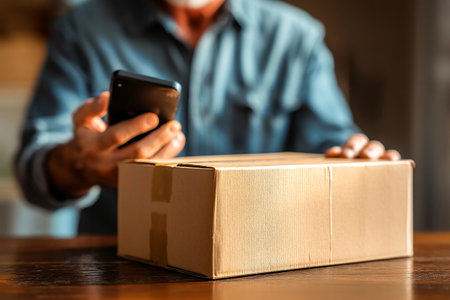 A man holds a smartphone to photograph a parcel on a wooden surface, documenting the delivery in a cozy indoor environment during daylight hours.
