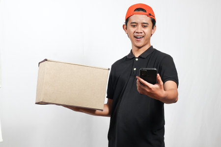 Smiling Asian delivery man holding a cardboard box and using mobile phone