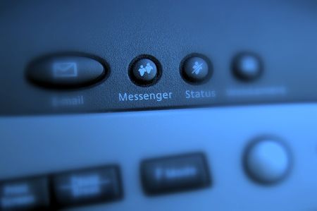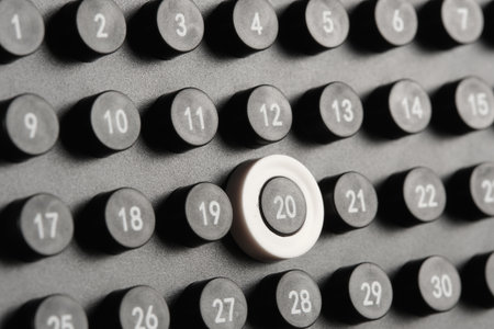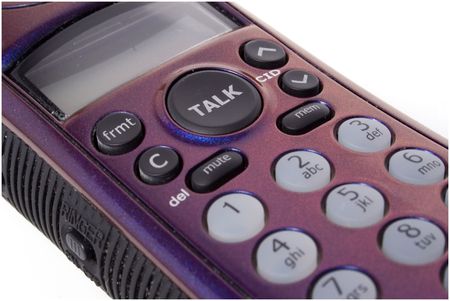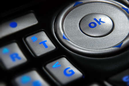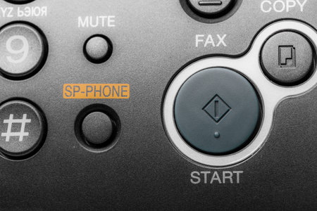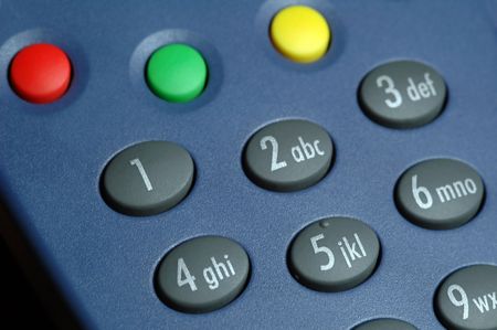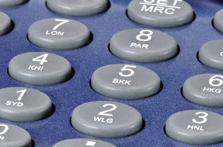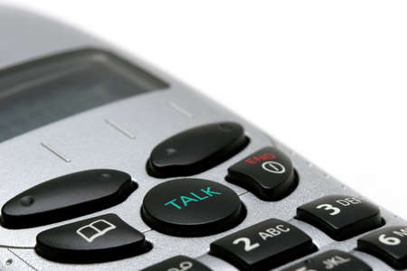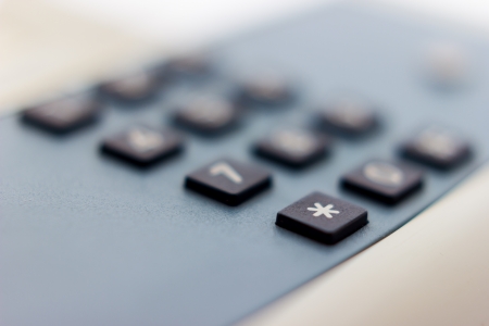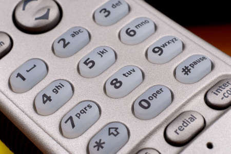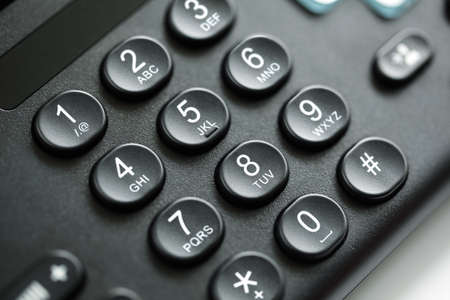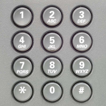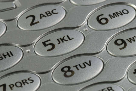 Macro abstract view of push button keypad numbers on a silver cordless household or office telephone, with neutral background