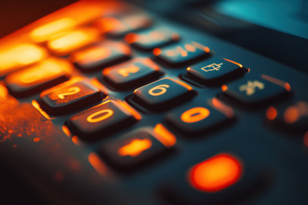 Illuminated keypad emanates a warm glow in an office space, creating a secure atmosphere with softly cast shadows and clean design elements.