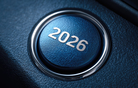 A close-up shot presents a circular blue button with the year 2026 imprinted on its surface. The button is set within a metallic ring against a dark backdrop. The composition is highly detailed, emphasizing texture and color. Suitable for commercial projects that discuss future, planning, or technological progress.